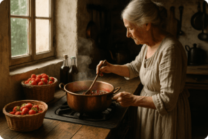 Sem açúcar branco, ela recorreu ao “must” — o mosto de uvas recém-prensadas, sobra natural do vinho. Usou esse líquido doce e concentrado para adoçar morangos e outras frutas. O resultado? Uma geleia pura, com sabor real de fruta, livre de aditivos e adoçantes artificiais